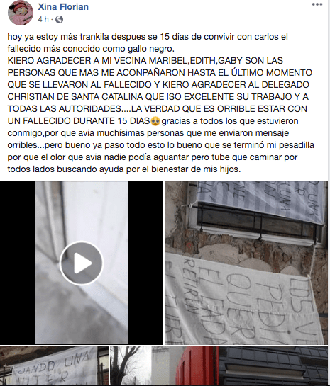La misma mujer, luego de que la opinión pública nacional se movilizara por el caso, posteó en la misma red social este viernes, cómo fue el desenlace de la historia: «hoy ya estoy más tranquila después se 15 días de convivir con Carlos, el fallecido, más conocido como Gallo Negro. Quiero agradecer a mi vecina Maribel, Edith y Gaby, que fueron las personas que más me acompañaron. Estuvieron hasta el último momento en que se llevaron al fallecido. También quiero agradecer al delegado Christian de Santa Catalina, que hizo un excelente trabajo, también a todas las autoridades».