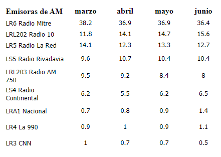 En junio, el consumo de radio en amplitud modulada se mantuvo estable y casi sin cambios. El monólogo de hace más de 10 años de Mitre, la radio de Clarín, duplicando a su inmediata perseguidora y mostrando que los porteños (más de la mitad en share) escuchan esa estación.