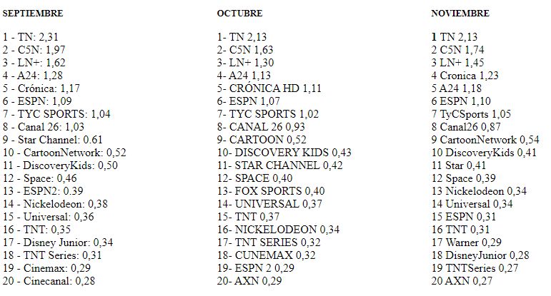 Rating de noviembre canales de cable, de 7 a 24 horas (Ibope Kantar Media):
