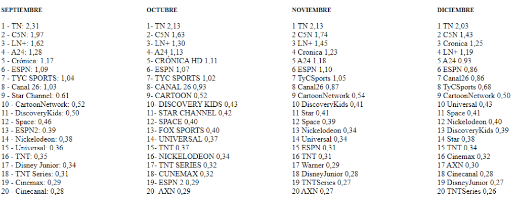 Rating de diciembre canales de cable, de 7 a 24 horas (Ibope Kantar Media):
