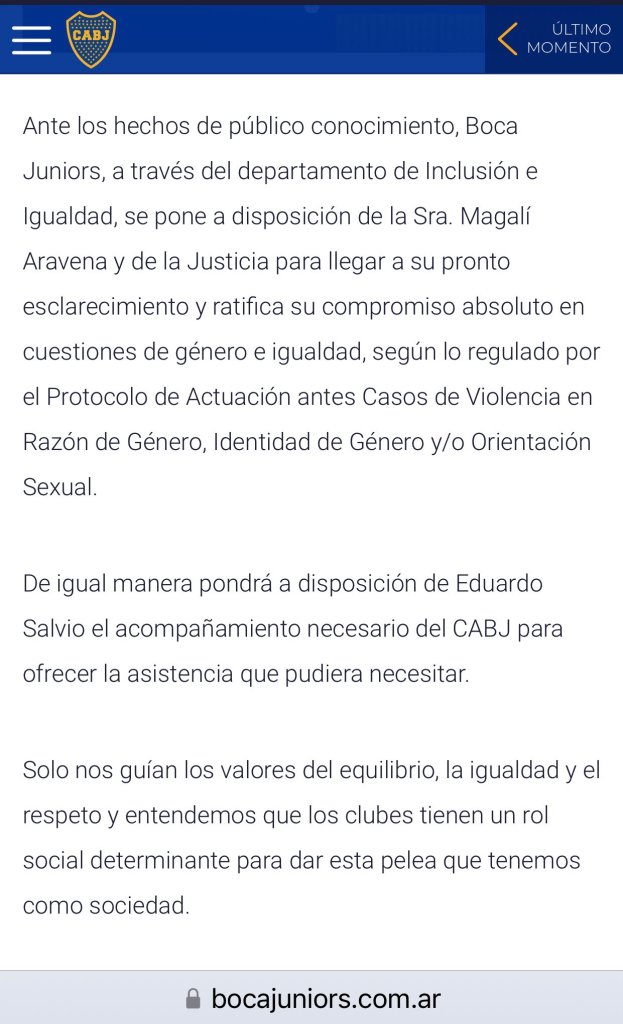 Boca manifestó esta tarde en un comunicado que se pone a disposición de la denunciante, de la Justicia y del propio jugador para llegar al «pronto esclarecimiento» del hecho y donde remarcó que «ratifica su compromiso absoluto en cuestiones de género e igualdad, según lo regulado por el Protocolo de Actuación antes Casos de Violencia en Razón de Género, Identidad de Género y/o Orientación Sexual».