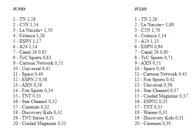 Las señales de cable de noticias de Buenos Aires (único lugar del país en que se miden) no mostraron variaciones durante el mes de julio. Con TN liderando y LN+ consolildando su segundo puesto, los demás conservaron sus ubicaciones.